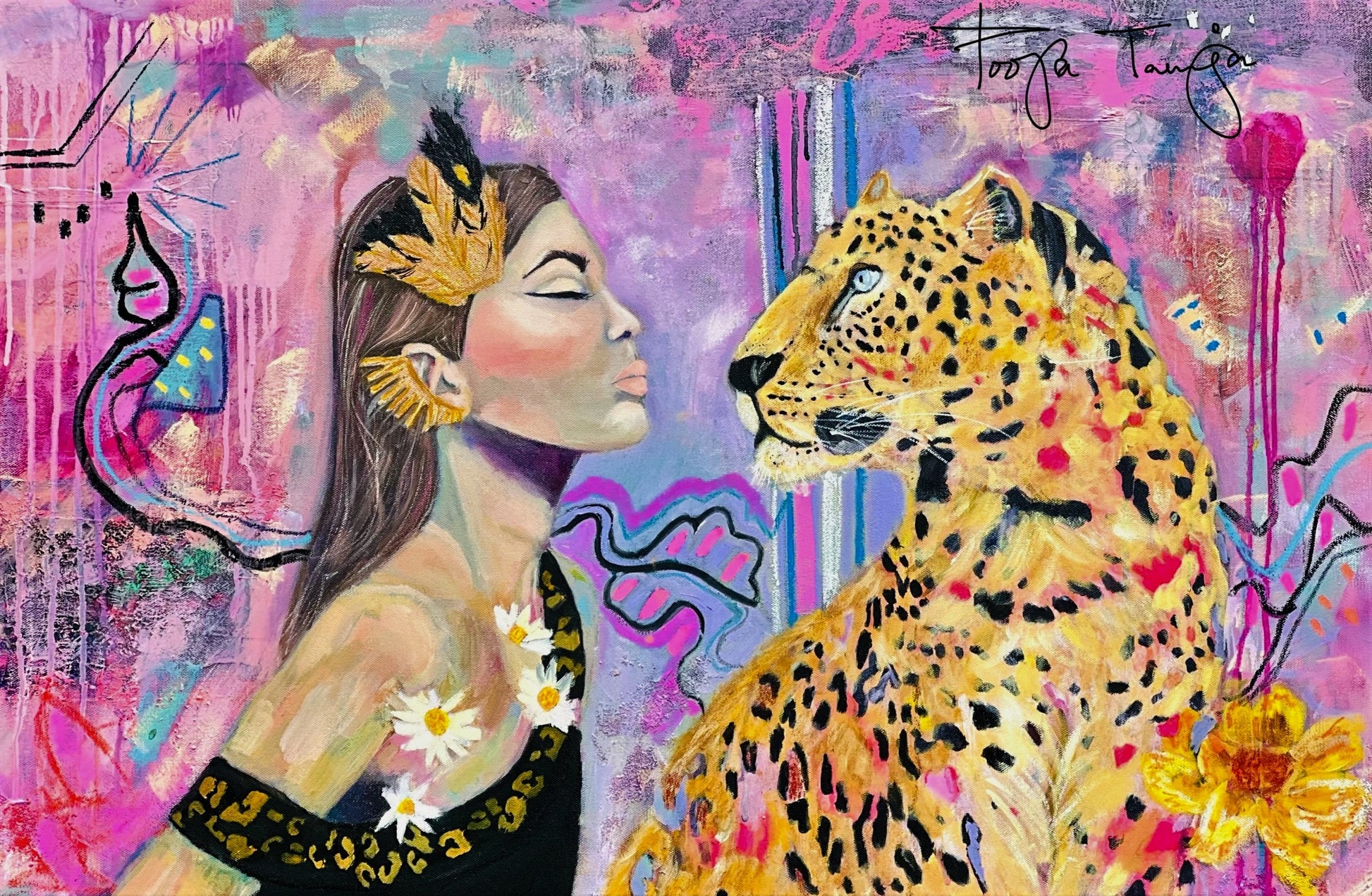 | 36 X 24" Mixed Media/Oil on professional grade gallery wrapped canvas, 1 1/2" depth Fierce captures an intense moment filled with emotions and energy, where the woman embodying strength and confidence faces the leopard that represents wildness interpretting on a free spirited lifesttyle. Specifications: Artist-grade oil paint used for intense color, depth, and longevity Heavy duty, archival-quality natural cotton canvas, gallery wrapped on a professionally-constructed frame using 1.5" profile kiln-dried stretcher bars Varnished with Gamvar gloss varnish by Gamblin for long-lasting protection Sides of the canvas have been finished with a continuation of the painting to complement the painting Mounting hardware included, ready to hang Artist signature will be included on the front of the painting Artist signature, date, and painting title will be included on the back of the painting |