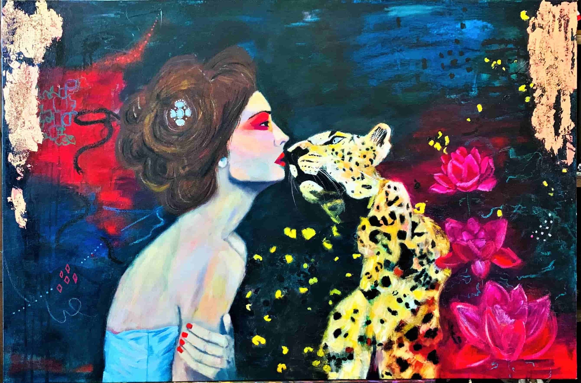 | 36 X 24" Mixed Media/Oil on professional grade gallery wrapped canvas, 1 1/2" depth Inner Strength features a piognant and evocative frame featuring a frail woman standing before a leopard, this powerful juxtaposition highlights the contrast between her delicate appearance and the fierce being which acts as a mirror for her. The artwork invites viewers to reflect on theirown journey of self discovery and the strength that resides within ,even in moments of vulnerability. Specifications: Artist-grade oil paint used for intense color, depth, and longevity Heavy duty, archival-quality natural cotton canvas, gallery wrapped on a professionally-constructed frame using 1.5" profile kiln-dried stretcher bars Varnished with Gamvar gloss varnish by Gamblin for long-lasting protection Sides of the canvas have been finished with a continuation of the painting to complement the painting Mounting hardware included, ready to hang Artist signature will be included on the front of the painting Artist signature, date, and painting title will be included on the back of the painting An artist-signed Certificate of Authenticity will accompany the artwork |